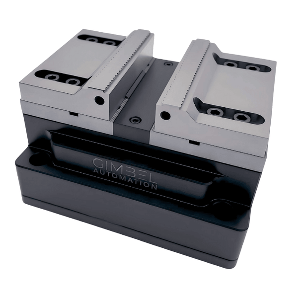 Gimbel Automation Self-Centering Air Vises have two key differences from other solutions on the market: (1) our Self-Centering Air Vises have an all-steel construction, and (2) the moving top of our air vises is fully serrated, enabling the hard jaws with matching serrations to be adjusted to any size in a few seconds. This means that there is no need for you to buy and machine unique soft jaws for each part you manufacture for your first operation. Instead, use the adjustable hard jaws for your first operation and machine second jaws only for second-op workholding as you need them.